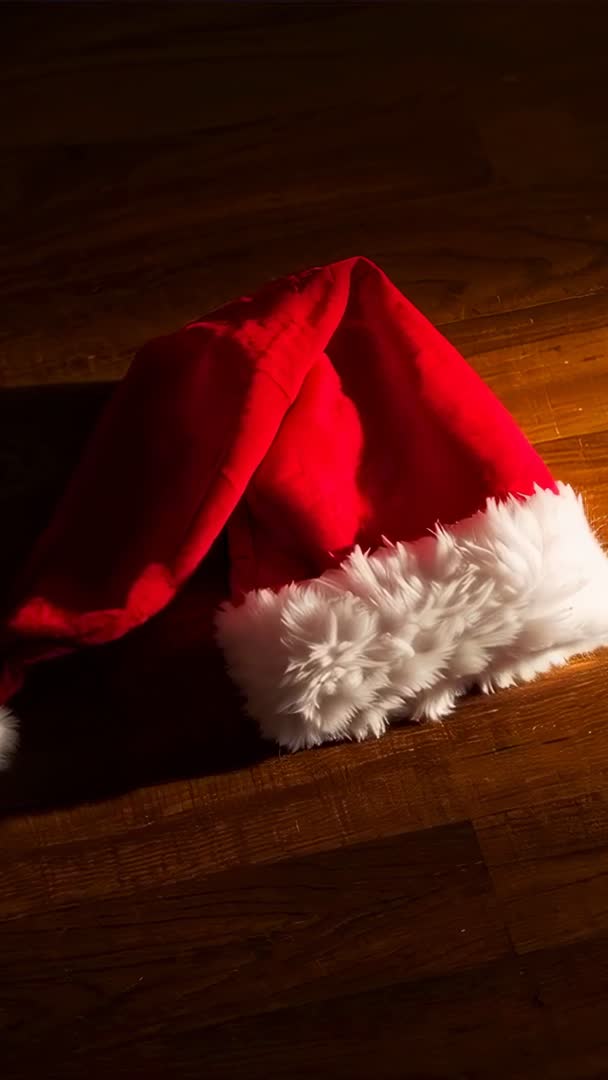 AI Generated Video. Video showing red Santa hat resting on dark wood floor while camera moving closer and revealing fluffy white fur trim and plush velvet texture. Warm side lighting casting long shadows and highlighting wood grain, creating cozy, nostalgic holiday mood. Slow push-in and shallow depth of field drawing focus to fabric details and tactile contrast. Working well as opening or cutaway clip for holiday ads, social media reels, e-commerce product pages, seasonal email headers, greeting card animations, in-store digital signage, background loop for festive events. Suitable for vertical-first platforms including Instagram Stories, TikTok, Reels, mobile-first websites. Color grading offering rich red tones and warm amber highlights for classic holiday look. File ideal for editors seeking simple, moody b-roll with natural lighting and minimal scene elements.