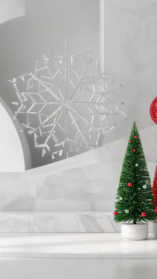 AI Generated Image. Vertical loop video showing sliding miniature Christmas trees on marble shelf, delicate glass snowflake hanging in background, red baubles descending along invisible track, fabric curtain gently unfurling. Minimalist color palette with white marble, green trees, red accents creating elegant holiday mood and ample left-side vertical copy space for text or logos. Looping 10-second clip suiting short-form social channels and vertical ad campaigns. Use for Instagram Stories, Reels, TikTok ads, mobile landing pages, product reveal overlays, email headers, and in-store digital signage. Recommended edits: placing logo or headline in left copy area, adding lower-third call-to-action, extending loop for continuous playback, exporting MP4 H.264 for mobile delivery, adjusting color grade to match brand. Mood tags: festive, elegant, minimalist, winter.