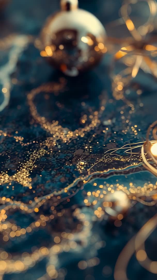 AI Generated Video. Vertical 9:16 clip showing slow rack focus from glittering tabletop to golden ornament ball and star-shaped lights. Shallow depth of field creating soft bokeh and warm gold-teal color contrast. Camera shifting focus while glitter trails and thin wire lights are catching highlights, creating cinematic shimmer and intimate holiday mood. Clip working well for Instagram Reels, TikTok, Stories, vertical ads, and landing page hero. Use for luxury product reveal, jewelry or watch campaign, boutique holiday promotion, event invitation background, seasonal social ads, or greeting animation. Suggestions: add text overlay, logo reveal, gentle slow zoom, repeating loop, subtle color grade, or soft vignette to enhance mood.
