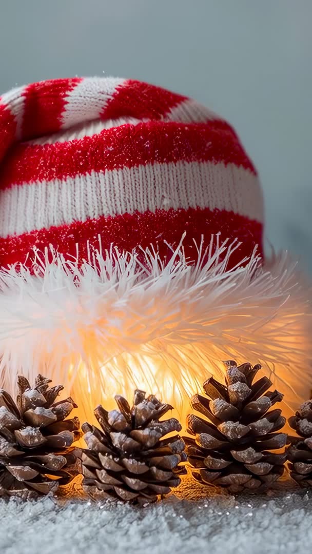 AI Generated Video. Vertical frame showing close-up of red and white striped knit hat with plush faux fur brim glowing from internal warm LED lights. Pine cones dusted with glitter and faux snow are lining foreground on glittery tabletop while camera is lifting in smooth vertical motion, creating cinematic reveal and soft bokeh background. Textures include knit stitches, fluffy faux fur, rough pine scales, and warm amber light. Use for Instagram Stories, TikTok, Reels, holiday ads, e-commerce banners, seasonal blog posts, greeting card videos, product packaging, craft tutorial intros, winter marketing campaigns. Suitable as vertical background for text overlays, countdowns, recipe or drink videos, holiday event promos, social media hero clips. Mood conveying cozy, festive, rustic charm. Color palette featuring red, white, warm amber, and neutral gray offering strong contrast for bold typography and logo placement.