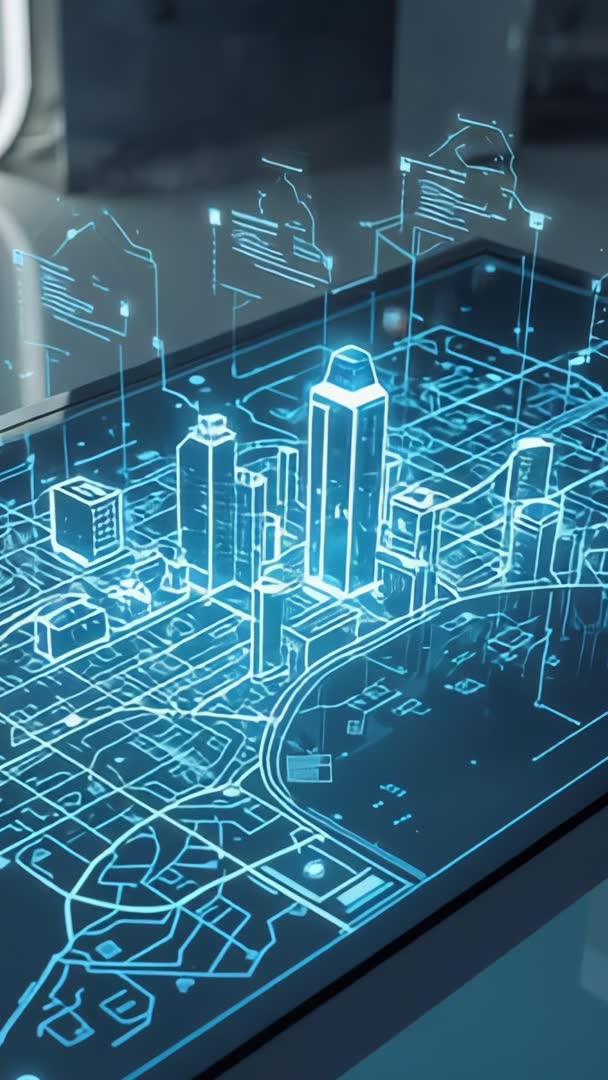 AI Generated Image. Vertical video showing holographic city model projecting floating data panels over tabletop in lab. Scene featuring neon blue 3D map, skyscraper wireframes, street grid, and interactive markers. Footage highlighting digital twin and smart city concepts, helping illustrate urban analytics, infrastructure planning, and IoT networks. Serving technology presentations, investor pitches, app demos, social media reels, conference openers, and educational tutorials. Including text overlays, animated infographics, and UI mockups that integrate with holographic elements for seamless branding. Vertical format optimizing mobile viewing and short-form content distribution.
