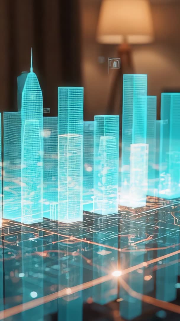 AI Generated Image. Showing vertical holographic wireframe city shifting colors from warm amber to cool cyan over illuminated smart grid tabletop inside office environment with soft lamp bokeh. Providing cinematic vertical video footage for smart city demos, AR marketing, architecture visualization, urban planning presentations, and technology conference backdrops. Serving as loopable background for social platforms, mobile reels, product ads, investor pitch reels, and corporate innovation pages. Enhancing slides and motion edits by overlaying data icons, map overlays, and grid lines to emphasize connectivity, IoT networks, traffic flow, and infrastructure modeling. Offering high-resolution vertical framing optimized for mobile-first platforms and portrait storytelling. Color palette transition creating dynamic contrast for modern tech brand narratives. Suggesting use in product launch videos, architectural walkthroughs, UX concept demos, broadcast graphics, and educational content about future city systems.