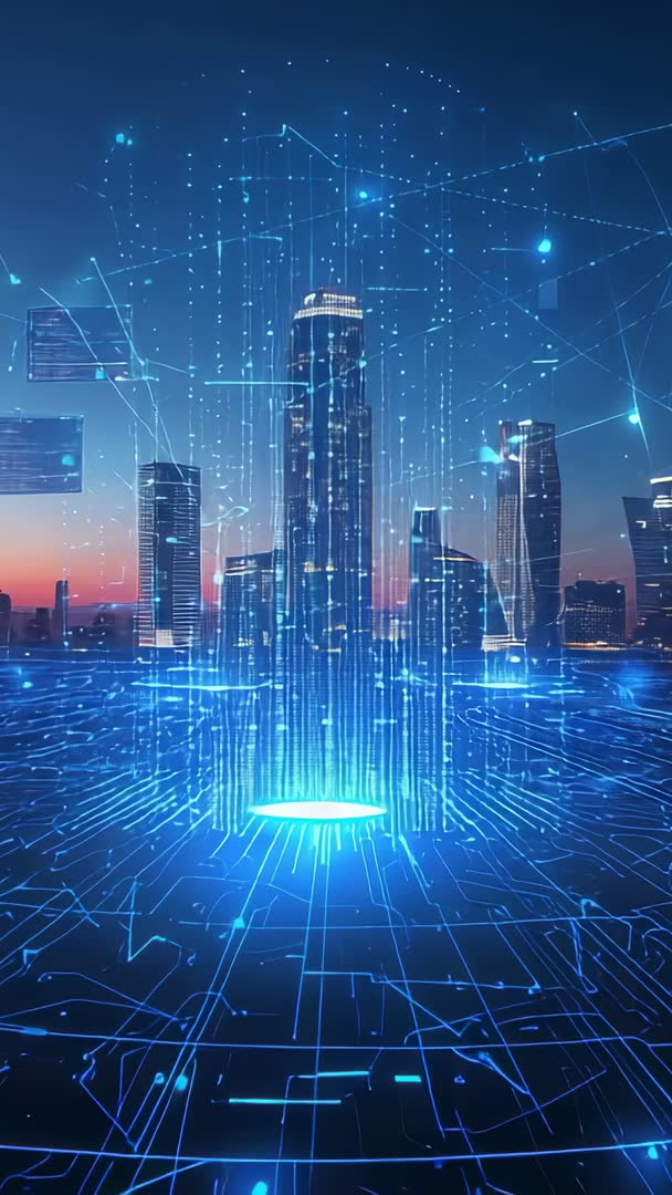 AI Generated Image. Vertical loop video showcasing holographic skyline rising from flickering neon grid over glowing circuit platform. Featuring cascading data streams, floating particle nodes, and wireframe skyscrapers connecting into digital network. Color palette leaning toward electric blue and cyan with warm sunset horizon providing depth and contrast. Suiting tech presentations, startup promos, smart city demos, AR/VR intros, mobile app openings, and social media story ads. Working as loopable background for keynote slides, website hero sections, broadcast graphics, and VJ visuals. Editing tips: overlay logo, add headline text, adjust speed for dramatic build, color grade to match brand, mix with ambient electronic soundtrack for immersive mood. Best used in vertical 9:16 format, optimized for mobile and social platforms, and ready for motion design projects, futuristic concept videos, or product launch visuals.