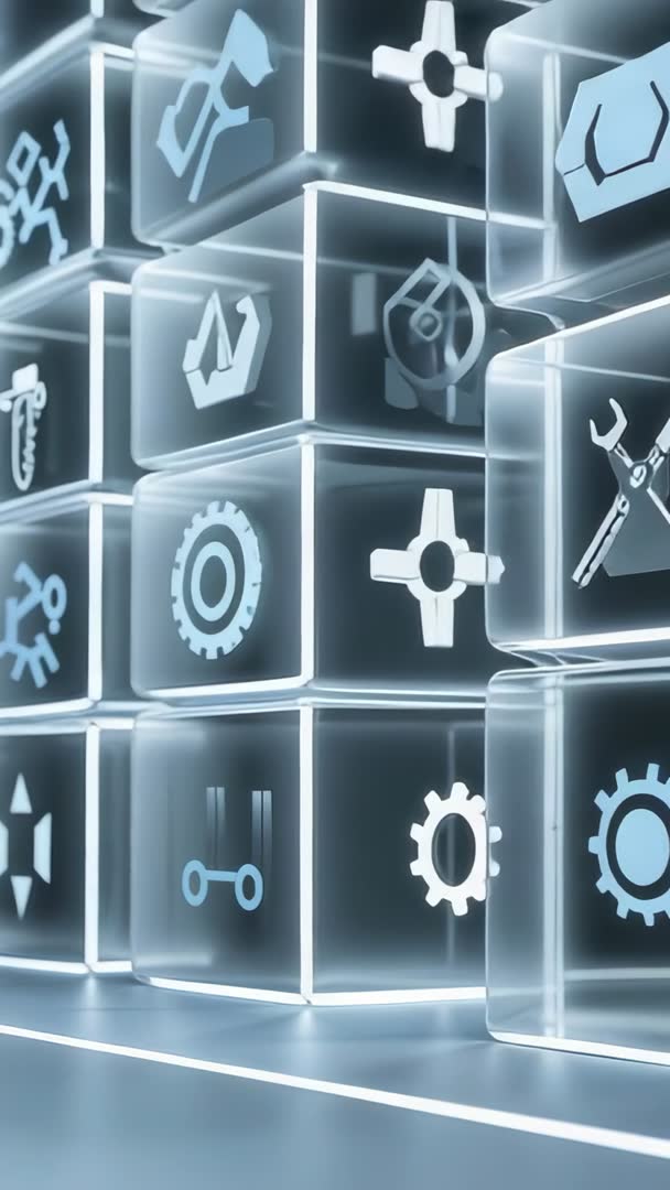 Vertical holographic cubes assembling and reintegrating while showcasing engineering icons Video