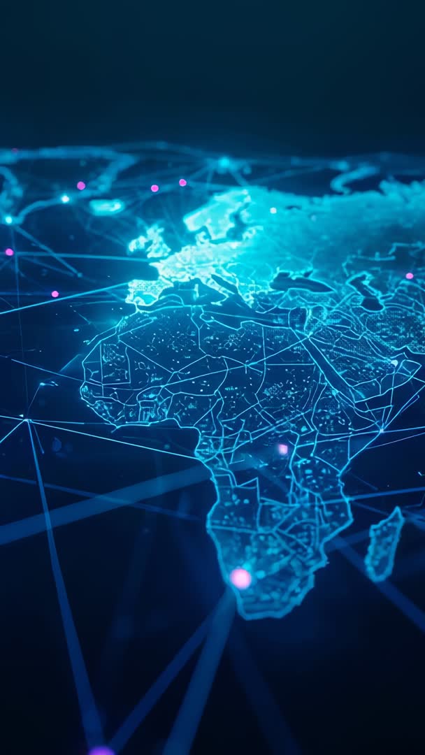 AI Generated Image. Tilting camera revealing holographic map of Africa and Europe, pulsing nodes sending data along glowing connection lines across network grid. Neon blue palette creating futuristic mood with deep depth of field and subtle particle motion. Vertical orientation optimizing layout for mobile and social platforms, looping for seamless playback. Use for tech intros, startup pitch decks, app launch promos, telecom and cybersecurity presentations, news graphics, educational content on geography or data networks, mobile wallpaper, and IG Reels or TikTok backgrounds. Ideal for overlaying bold headlines and motion graphics; leave safe space at top and bottom for UI elements and captions.