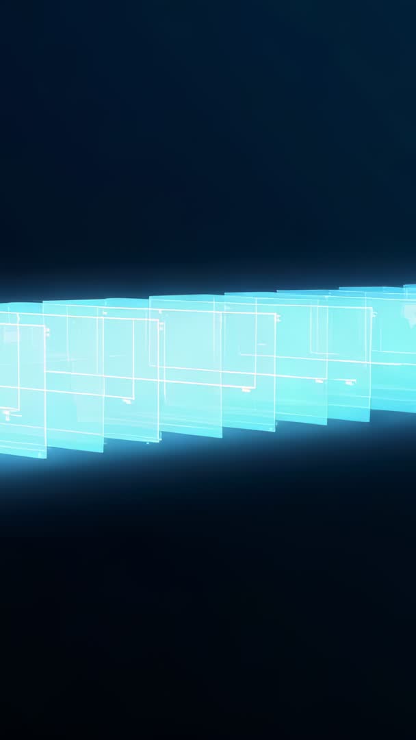 Vertical holographic panels sliding across navy data plane, glowing cyan wireframe motion Video
