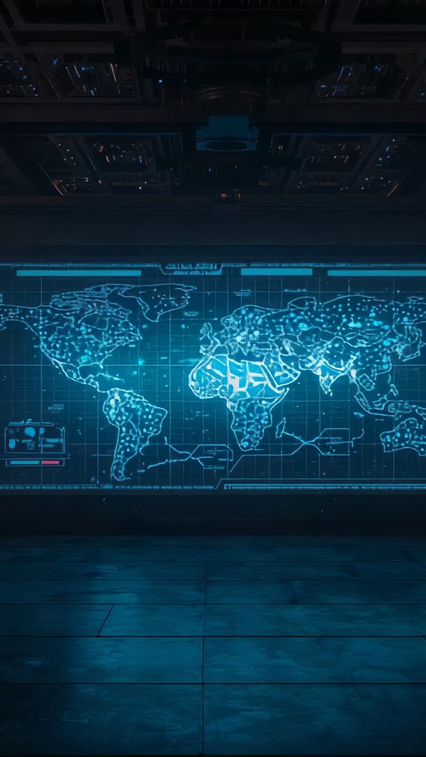 - Vertical Holographic World Map Booting with Pulsing Network Nodes and HUD Interface