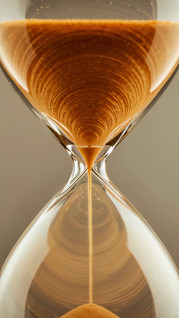 AI Generated Image. Closeup vertical footage showing brown sand spiraling through narrow hourglass neck, forming tight concentric vortex while grains stream into lower chamber. Glass reflections and warm amber tones highlighting texture of individual grains and suspended dust motes, creating cinematic minimal aesthetic. Shot in studio with soft directional lighting and shallow depth of field, producing crisp detail and smooth motion ideal for slow-motion or looped playback. Use for mobile-first content: social reels, stories, TikTok, YouTube Shorts, app intros and vertical ads. Apply as countdown background, time-lapse or transition for productivity campaigns, mindfulness and meditation videos, legal or financial deadline visuals, educational sequences about time measurement, and title screens for documentaries. Include overlay text or logo in upper or lower thirds where negative space is available; color grade to match brand palette or convert to monochrome for dramatic effect.