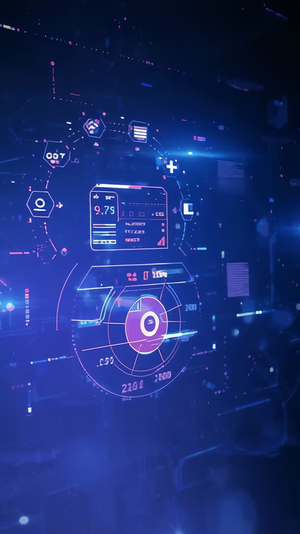 AI Generated Video. Showing holographic HUD boot sequence with pulsing nodes, circular radar dial, and updating data card in deep blue 3D space. Emphasizing neon accents, hexagonal glyphs, and layered UI elements for high-tech aesthetic. Offering vertical composition optimized for social platforms, app intros, and mobile promos. Working well for tech product reveals, cybersecurity or data analytics presentations, futuristic trailers, streaming overlays, and motion graphics templates. Allowing easy text or logo overlay, color grading, and seamless looping for background visuals and broadcast graphics.