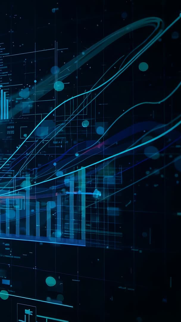 AI Generated Image. Vertical video showing HUD dashboard receiving live data update with neon bar chart and flowing nodes. Holographic interface style using deep navy background with cyan and teal glowing lines and circular nodes conveying network activity. Motion elements providing sense of real-time analytics, streaming data flow, and performance metrics. Suiting tech presentations, fintech demos, UI product videos, startup pitch decks, social media stories, and vertical ad campaigns. Editing suggestions: Overlaying logo and headline on upper third, adding subtle electronic soundtrack, looping segment for background display, applying slow motion and color shift for emphasis. Technical details: Featuring 9:16 vertical composition, layered vector elements for parallax, RGB neon palette, ready for Premiere Pro and After Effects workflows.