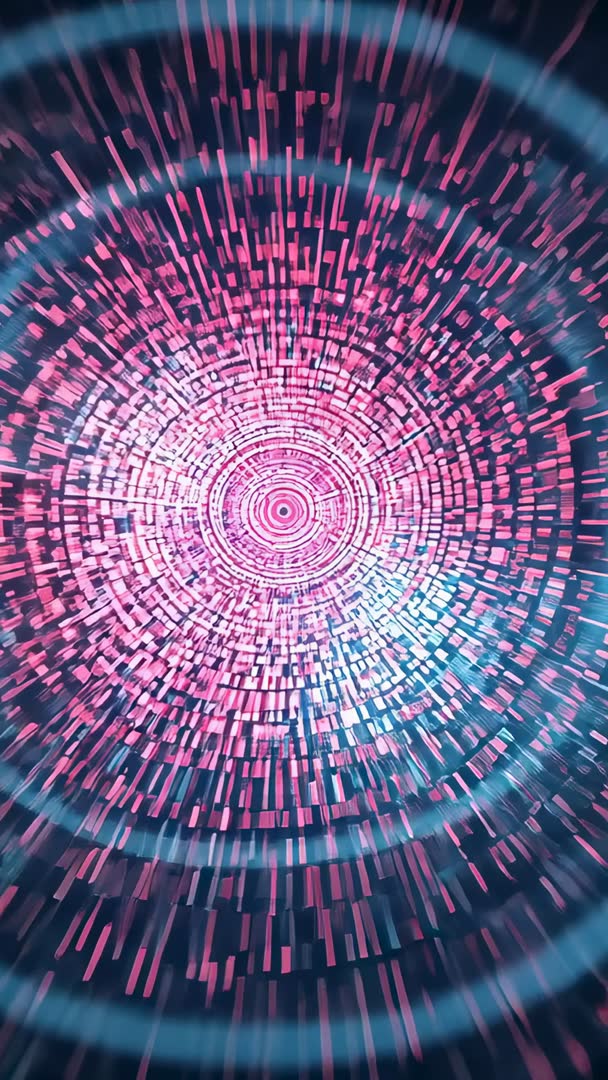 AI Generated Image. Showcasing vertical HUD tunnel with pink blocks radiating outward and teal concentric rings. Creating fast-paced cyberpunk energy with neon glow, radial motion and streak trails. Serving as ideal opener for tech intros, app promos, social media stories, vertical ads, music visualizers, gaming intros, VJ loops and broadcast stings. Working well as background for title cards, logo reveals, lower thirds and transitions. Offering loop-friendly rhythm and high-contrast color palette ready for color grading and audio sync. Providing downloadable clip for designers wanting futuristic UI overlays, promo reels or UX concept demos. Delivering attention-grabbing motion for mobile-first campaigns and vertical video platforms.