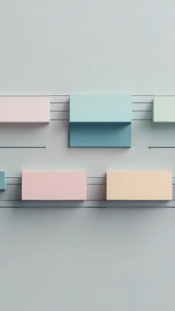 AI Generated Image. Vertical infographic animation showing pastel-colored boxes flipping open to reveal interior panels on soft neutral backdrop. Thin horizontal lines and directional arrows guiding eye along timeline, establishing clear left-to-right flow for sequential data. Subtle shadows and flat color blocks creating modern, minimal, professional aesthetic. Ideal for mobile social ads, vertical social platforms, app onboarding, product roadmap highlights, corporate presentations, explainer videos, process walkthroughs, educational tutorials, startup pitch decks. Pairing on-screen text, icon overlays, voiceover, or numeric data to illustrate steps, milestones, or comparisons. Looping-friendly composition and generous top and bottom space allowing safe area for headlines and captions.