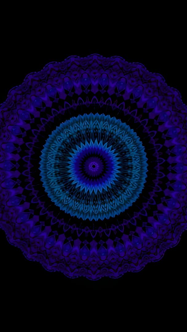 AI Generated Image. Pulsing blue mandala rotating slowly in black void with concentric rings and intricate geometric symmetry. High-contrast neon blues and deep purples creating hypnotic focal point for mindfulness practice and visual therapy. Serving as vertical 9:16 loop, looping seamlessly for continuous playback and easy integration into live sets. Suitable for meditation sessions, music visualizers, social media reels, live stream backgrounds, VJ performances, yoga classes, and ambient installations. Color palette and motion allowing easy blending with ambient soundtracks, slow beats, guided breathing tracks; speed and color grading adjustable for custom mood. Use as intro or background in relaxation apps, electronic music videos, stage projections, screen savers, or smartphone wallpapers.