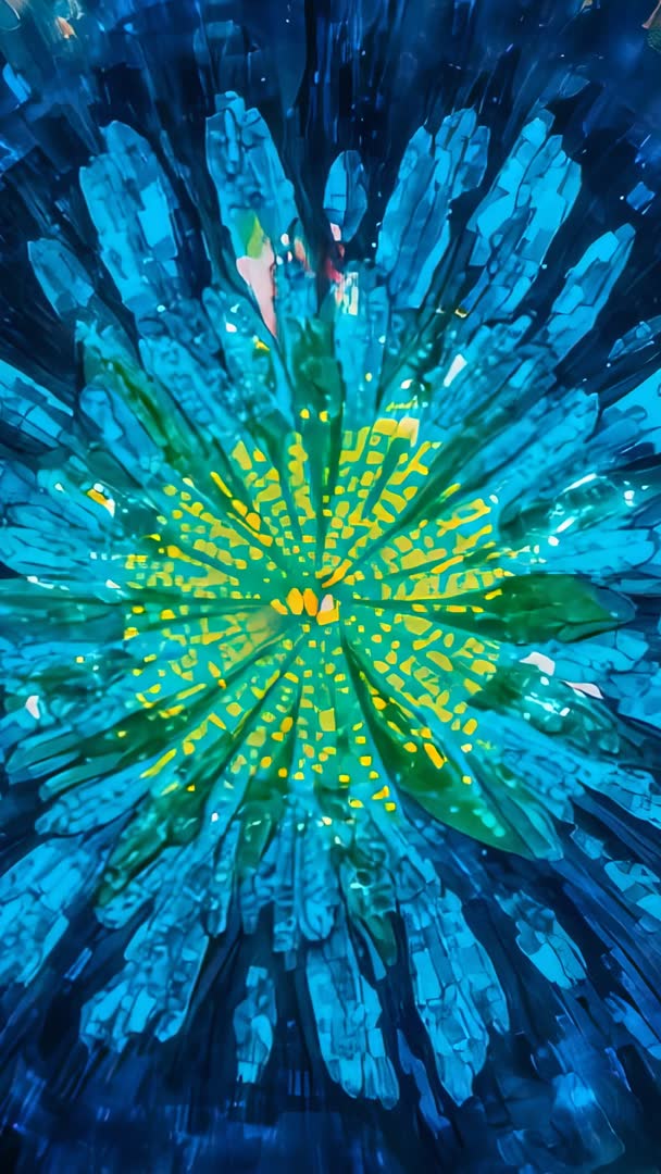 AI Generated Image. Pulsing kaleidoscope animation zooming into neon teal and yellow center, forming radial petal-like grid and symmetrical patterns. Suiting music video backgrounds, VJ loops, club visuals, meditation apps, app intros, social media stories, promotional reels. Enhancing electronic music performances, festival visuals, tech presentations, creative websites. Offering seamless loop potential for long-form backgrounds and ambient screens. Providing high-contrast neon palette that is drawing attention and supporting psychedelic, futuristic, meditative themes. Including vertical video framing for mobile-first platforms and story formats. Perfect for transitions, title reveal, energy build or visualizer for audio tracks.
