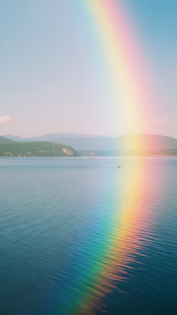 AI Generated Image. Video captures sunlight creating vivid vertical rainbow drifting over placid lake, reflecting bright spectrum across rippling water near small boat and distant forested shoreline. Soft pastel sky and layered mountain horizon provide peaceful backdrop while bold prism band draws eye from sky down into water. Vertical 9:16 composition offering abundant negative space on left for text, logo, or captions and strong central visual element for social media reels and stories. Ideal for use in travel promos, wellness and meditation content, relaxation app backgrounds, smartphone wallpapers, environmental campaigns, weather and nature segments, tourism websites, greeting cards, and editorial features. Color grading and slow-motion editing recommended to enhance iridescent tones and amplify calming mood.