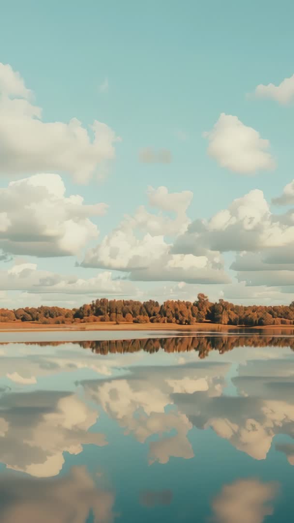 AI Generated Image. Panning up from calm lake toward golden trees, reflecting clouds across mirror-smooth water. Featuring vertical composition with expansive sky area for overlay text or logo. Working well for mindfulness and wellness videos, social media reels, mobile wallpapers, website hero banners, travel promos, and meditation apps. Evoking calm, balance, and natural beauty, supporting messaging about relaxation, slow living, and sustainable travel. Captured during golden hour with warm tones and soft light, enabling seamless looping and gentle color grading.