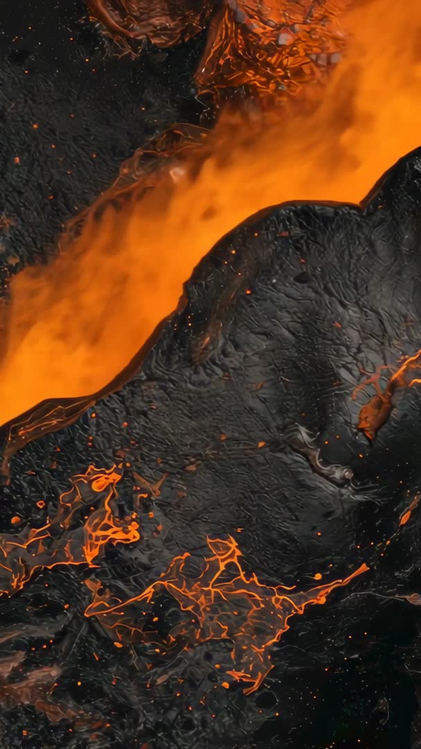 AI Generated Image. Footage showing lava flowing through cooled basalt crust, sending steam, embers, and sparks. Visual creating dramatic contrast between glowing molten channel and dark solidified rock. Suiting documentary sequences, geology and earth science lessons, hazard awareness spots, nature series. Working well as dynamic vertical background for mobile content, social media Stories, Reels, and TikTok. Providing strong VFX reference, texture overlays, and promotional assets for travel, adventure, and science campaigns. Capturing intense color and motion for title intros, transitions, or looping backgrounds on vertical screens.