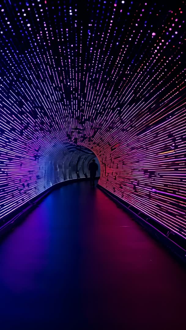 - Vertical LED Tunnel Walkthrough with Silhouette Couple in Neon Radial Light Installation
