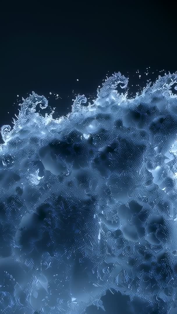 AI Generated Video. Video showing luminous translucent foam mass evolving across frames, curling into crystalline crest and emitting sparkling droplets against deep dark void. Motion design highlighting glossy bubbles, iridescent highlights, fine spray and organic cellular textures, optimized for vertical loop playback. Serving as background for title sequences, music visuals, tech product launches, environmental campaigns, mobile vertical ads, social media reels and immersive gallery projections. Pairing with ambient soundtrack for meditative mood or with electronic beat for high-energy promo. Color grading and blending modes allowing easy customization for brand integration; high-resolution frames supporting slow-motion and crop-safe editing.