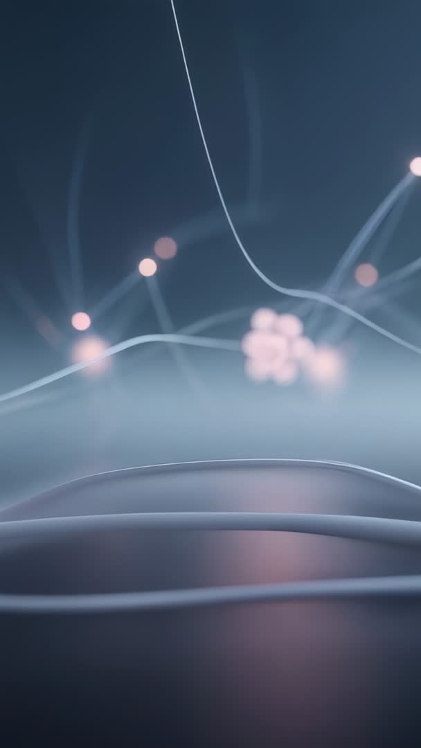 AI Generated Image. Showcasing vertical 9:16 loop-ready sequence of glowing nodes pulsing and drifting along slender filaments against deep blue gradient. Presenting smooth curved bands in foreground with shallow depth of field and soft bokeh highlights, creating sense of depth and calm motion. Serving tech branding, app intro screens, product demo backgrounds, social media stories, event visuals and presentation hero slides. Pairing with subtle ambient soundtrack and minimal typography for modern corporate or sci-fi projects. Offering flexible color grading and seamless looping for long-form backgrounds and motion design templates.