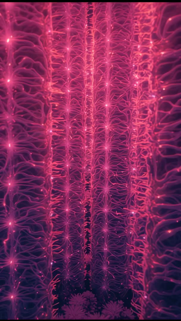 AI Generated Image. Featuring vertical loop of pulsing filament grid with glowing nodal sparks and neon magenta light. Showing rhythmic energy flow along tangled filaments, creating immersive futuristic atmosphere. Looping seamlessly for use in motion backgrounds, VJ sets, social vertical ads, and mobile wallpapers. Fitting tech product promos, music visualizers, sci-fi title sequences, UI backgrounds, and immersive installation projections. Providing high-contrast neon palette for bold branding and soundtrack synchronization. Including 60-second vertical clip optimized for TikTok, Instagram Reels, and mobile display. Delivering loop-friendly seamless start and end for overlays and background fills. Ideal for designers seeking abstract glowing network visuals, developers creating sci-fi UI elements, and artists building generative motion content.