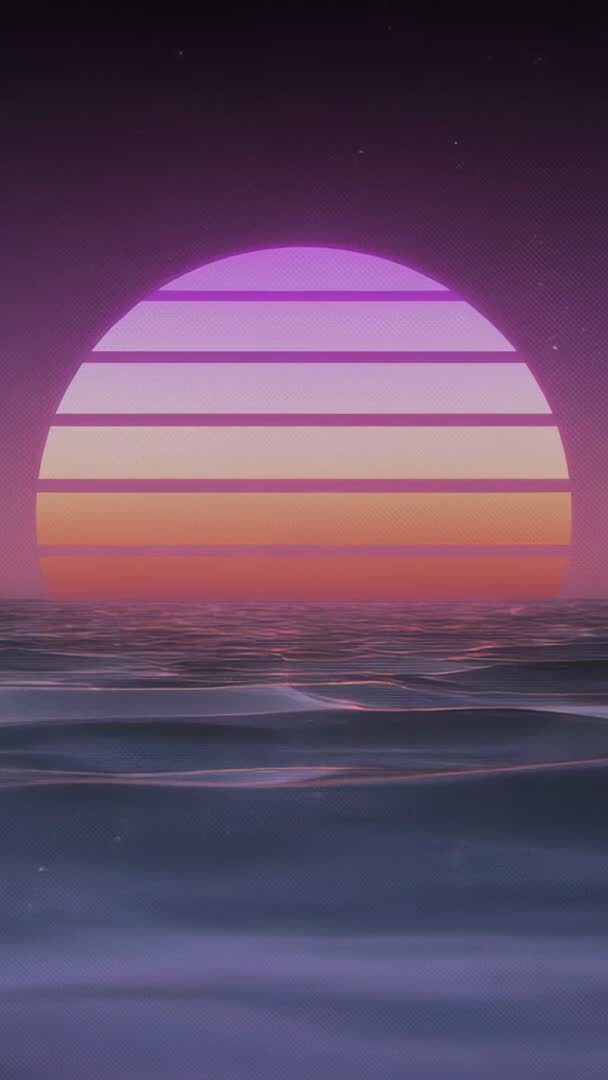 - Vertical loop showing stylized neon sun over calm sunset ocean with particle motion