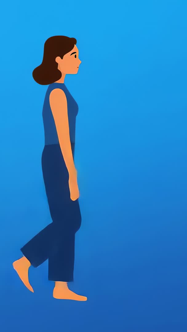 AI Generated Video. Vertical loop video showing animated woman walking right across blue gradient background, wearing blue sleeveless top and navy pants while barefoot. Minimalist vector style using flat colors and simple shapes, offering clean composition and strong negative space for text overlays. Looping motion emphasizing calm walk cycle and side profile, suitable for portrait mobile displays. Use for mobile app onboarding, social media stories, Instagram Reels, TikTok clips, website hero banners, product demos, and explainer videos. Customize colors and clothing to match brand palettes or add subtle motion effects and background elements. Delivering quick visual interest while maintaining space for headlines, call to action, or logo placement.