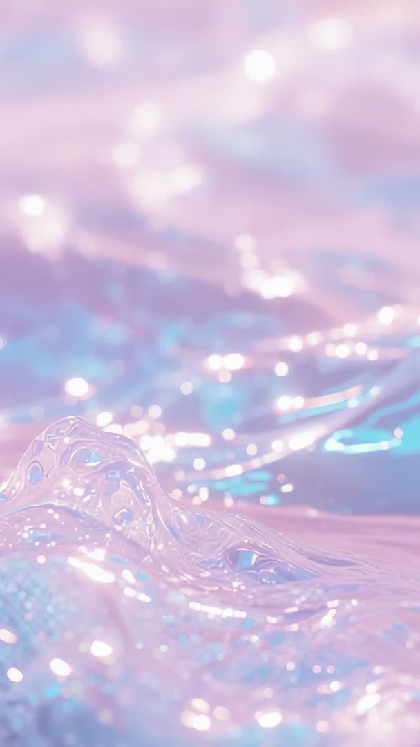 AI Generated Image. Video showing pastel light reflecting on iridescent fluid, producing soft shimmering waves and bokeh highlights. Close-up evolving peaks and ripples creating dreamy gradient of pinks, lavenders, blues and pearlescent sheen. Ideal for music visualizers, loopable backgrounds for apps, social media reels, smartphone wallpapers, beauty and wellness promos, fashion intros. Serving as ambient backdrop for product displays, title cards, promotional sequences, on-screen transitions, and mood films. Smooth loop and vertical orientation suiting mobile-first platforms and stories. High-resolution capture working well with color grading and blending modes, integrating with brand animations.
