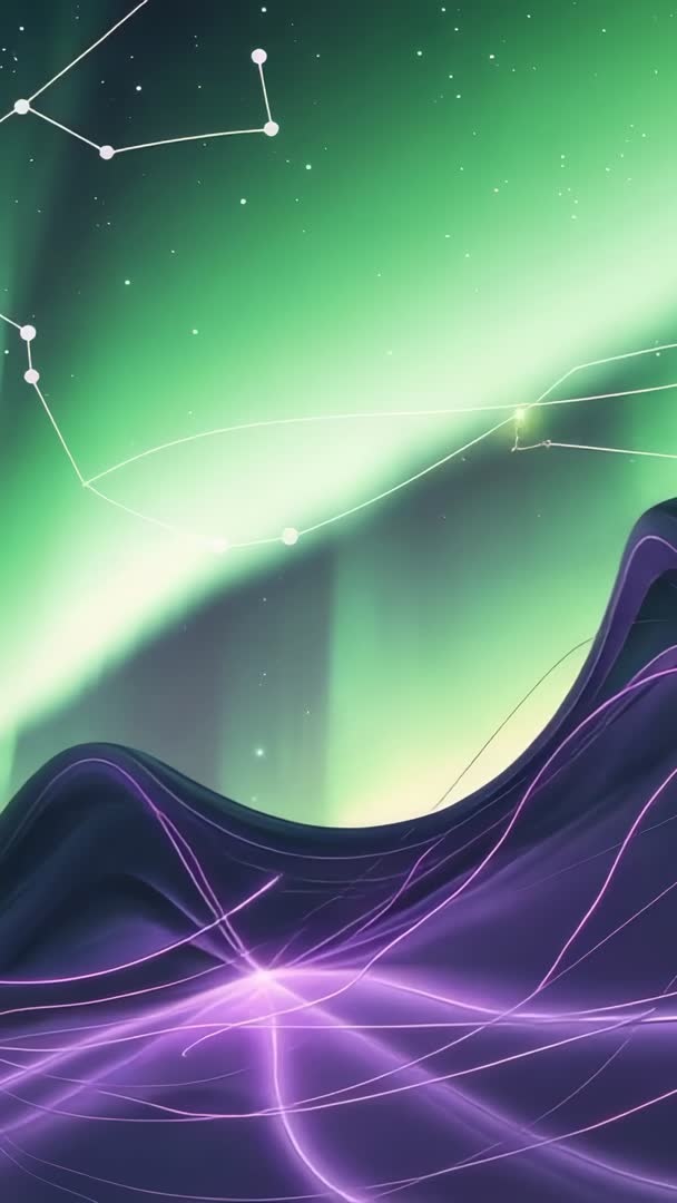 AI Generated Image. Vertical looped clip showing pulsing purple wave flowing across sculpted horizon while shifting green aurora and flickering star lines tracing constellation paths. Foreground wave emitting neon purple glow and thin energy trails, creating strong sense of depth and cinematic movement. Color palette combining vivid greens, deep purples, and neon magenta accents for striking contrast. Working great for mobile background loops, social media stories, vertical ads, app intros, music visualizers, event openers, sci-fi trailers, meditation or wellness apps, and screensavers. Combining with ambient electronic soundtrack, subtle parallax, or slow zoom for adding cinematic polish and immersive atmosphere. Looping composition allowing seamless repetition for long-form displays and live visual sets.