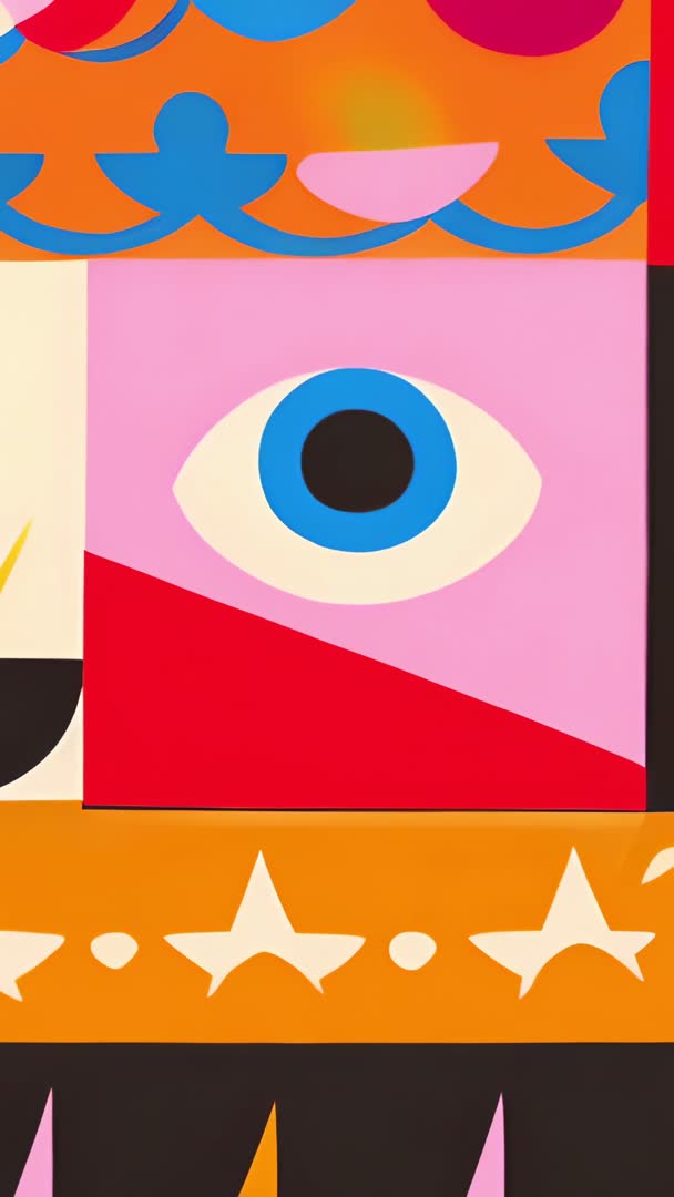AI Generated Image. Looping vertical animation presenting geometric panels with bold color blocks and single stylized eye motif. Drifting pink petal moving across orange decorative band while contrasting blue and red shapes create rhythmic motion. Minimal composition and high contrast palette creating eye-catching mobile-first visuals. Ideal for social media loops, Instagram Stories, TikTok backgrounds, mobile ads, app intros, digital signage. Serving as title overlay, transition element, animated wallpaper, or backdrop for music and fashion promotions. Offering seamless loop playback and strong graphic language for brand campaigns, editorial motion pieces, gallery installations. Delivery suggestions: export at 9:16 aspect ratio, use loop-enabled format (MP4 or GIF), pair with upbeat or ambient audio to amplify mood.