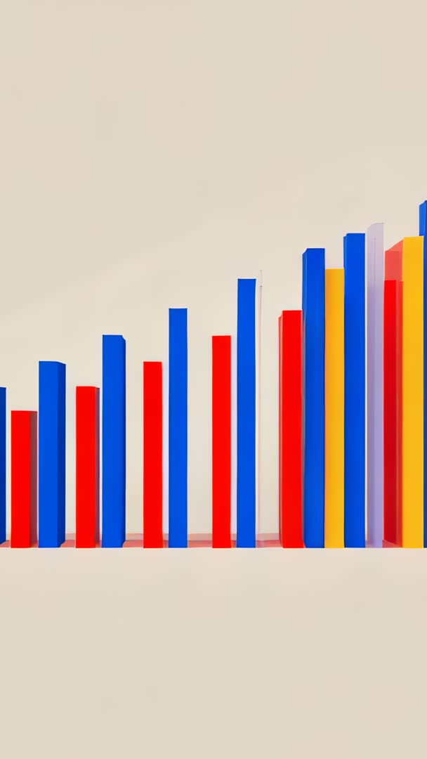 AI Generated Image. Showing vertical looping motion graphics featuring alternating blue and red 3D bars with yellow and purple accents, waving and gradually ascending along beige studio base. Vertical composition emphasizing rhythmic lateral shifts and height variation, creating sense of momentum, growth, and playful rhythm. Crisp minimal palette offering strong contrast for overlaying text, icons, or data labels. Serving as dynamic background for vertical ads, mobile landing pages, social media short-form content. Highlighting rising metrics, growth trends, sales performance, or product launch announcements in business presentations and marketing reels. Working well as looping hero background for websites, app demo reels, trade show displays, digital signage, or creative motion design projects. Offering clean negative space at top and bottom for inserting headlines, logos, captions, or call-to-action elements.