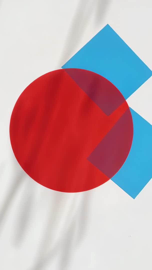 AI Generated Image. Vertical looping animation showcasing translucent cyan planes orbiting bold red circle and creating purple overlap over draped white cloth. Suiting mobile stories, social media reels, vertical ads, app splash screens, and UI backgrounds. Providing strong color contrast and clean geometric composition for branding, tech presentations, and product launches. Allowing text overlay in ample white space for headlines, call-to-action buttons, and logo placement. Working well as seamless loop for motion graphics, website hero sections, and digital signage. Including editing suggestions such as applying soft vignette, adjusting color grading to match brand palette, and using blend modes to enhance translucent overlap. Offering tactile fabric texture that adds depth and subtle movement for modern, minimal design projects.