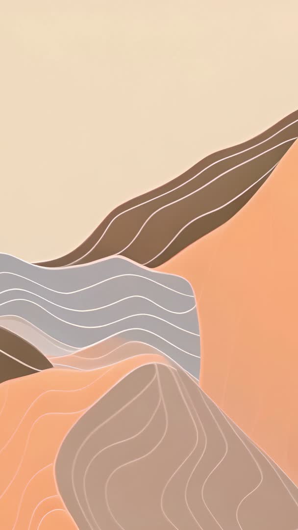 AI Generated Image. Vertical looping animation showing drifting dashed lines rising and falling across muted pastel hills on cream background. Smooth wavy contours and thin white strokes creating sense of depth and gentle motion. Looping rhythm working well for mobile wallpaper, social media story backgrounds, app intros, and ambient video loops. Minimal color palette with beige, warm peach, soft taupe, and cool gray supporting calming mood for wellness, lifestyle, interior design, and brand identity projects. High vertical aspect making ideal for smartphone display, vertical ad, or reel usage. Serving for header animation, transition clip, or subtle background during product showcase, meditation video, or boutique website. Color palette allowing easy recolor for brand matching. Looping seamlessly for endless playback and smooth transitions in timeline-driven projects.