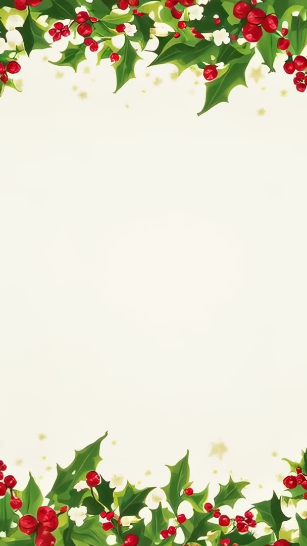 AI Generated Video. Providing vertical looping holly border with glossy red berries and subtle glowing gold flecks set on cream panel. Designed for mobile stories, social media reels, animated greeting cards, and holiday promo videos. Leaving generous center space for adding animated text, logos, or countdown overlays. Pairing well with warm music, handwritten fonts, and vintage color palettes for cozy seasonal branding. Exporting as seamless loop for continuous display in digital signage, retail screens, email greetings, or smartphone wallpapers. Offering easy color and speed customization to match brand tone and campaign length.
