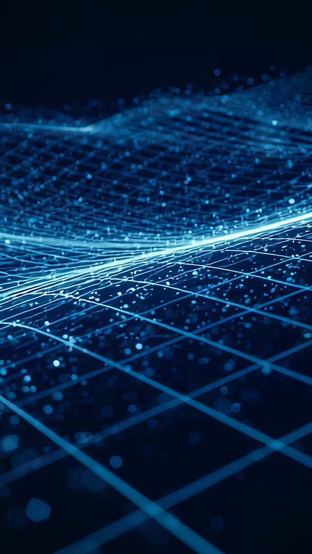 AI Generated Image. Showcasing pulsing light band flowing across blue wireframe grid while tiny sparks drifting above lattice. Featuring smooth parallax depth and soft bokeh highlights, creating sense of scale and continuous motion. Vertical 9:16 composition optimized for smartphone playback and social stories, looping seamlessly for endless background. Suited for tech app intros, product promos, startup pitches, social media ads, event visuals, broadcast stings, and digital signage. Usage tips: overlaying bold headline or logo on darker upper area, matching color grade to brand palette, slowing playback for cinematic mood, combining with ambient electronic soundtrack for immersive feel.