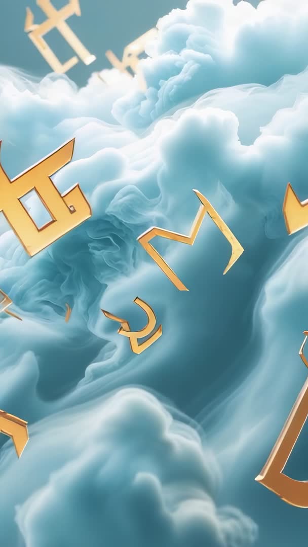 - Vertical looping video of golden geometric symbols rotating through serene blue cloudscape