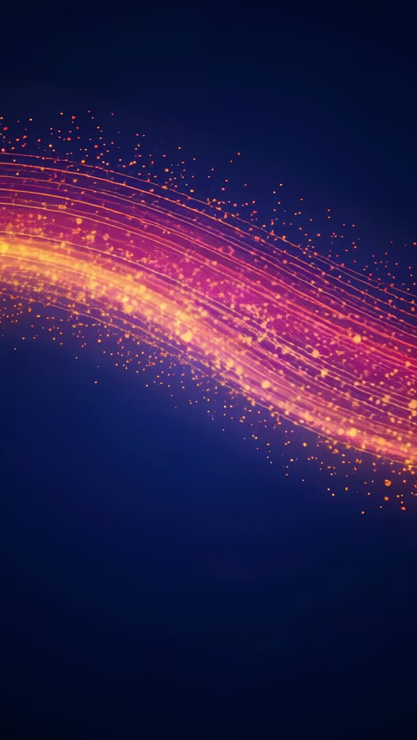 AI Generated Video. Vertical loopable clip featuring luminous particle ribbon sliding across deep navy canvas, pulsing gold and magenta sparks and trailing thin light lines. Smooth flowing motion and high-contrast color palette creating cinematic energy and futuristic mood. Suited for title sequences, app intros, event promos, music visuals, social media stories, website headers, digital ads. Useful as overlay element, background loop, lower thirds fill, transition plate, or brand intro. Compatible with 9:16 vertical format and easy to loop or color-grade to match brand palette. Production tips: keep center clear for text or logo, add subtle motion blur for depth, adjust playback speed for dramatic or relaxed pacing.