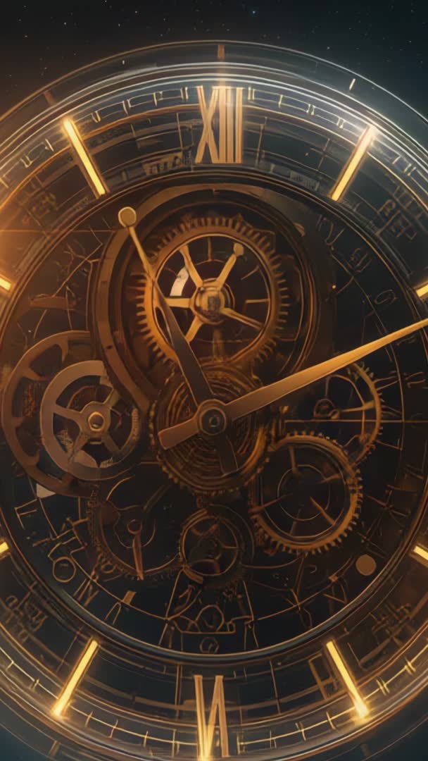 AI Generated Image. Showing ornate golden clock face with spinning gears and pulsing light against starfield background. Combining steampunk craftsmanship with futuristic chronometry for cinematic luxury look. Ideal for luxury brand intros, watch commercials, title sequences, countdowns, social media reels, and motion graphics projects. Vertical orientation matching mobile-first platforms and portrait video ads. Providing loopable motion, strong focal area for overlay text, and warm gold tones for premium branding. Delivering dramatic closeups for product storytelling, historical science segments, or sci-fi promotional content.