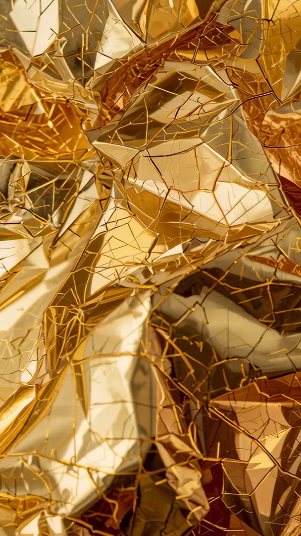 AI Generated Video. Vertical macro footage panning across crumpled gold foil, revealing intricate crackle mesh pattern across reflective folds. Studio lighting creating warm highlights and deep shadows, enhancing metallic sheen and perceived depth. Camera slowly moving, emphasizing texture, creases, fine fractures and mirror-like reflections. Close-up detail showcasing abstract geometry and shimmering surfaces, suitable for motion backgrounds, luxury product promos, fashion title sequences, jewelry or cosmetics branding, event openers, social media vertical ads, or editorial motion design. Loop-friendly sections providing seamless background options and safe composition for portrait mobile formats. Recommend color grading adjustments and subtle speed ramps to match brand tone and pacing.