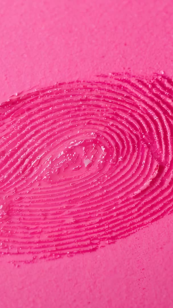 AI Generated Image. Vertical macro footage showing glossy embossed fingerprint gel on vibrant pink paper, lighting shifting to reveal ridged concentric texture and scattered droplets. Tight framing and vertical orientation making it ideal for social media stories, mobile ads, product packaging previews, cosmetic branding. High contrast and tactile detail working well for backgrounds, motion graphics, close-up transitions, editorial features on printmaking or packaging design. Suggested uses: looping short clip for Instagram Reels or TikTok, hero clip for product landing pages, texture overlay in video edits, background for cosmetic and beauty campaigns or promotional visuals.