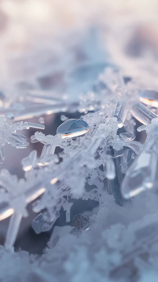 AI Generated Image. Vertical macro footage showing camera gliding across frost-covered surface, revealing intricate ice crystal geometry and single reflective water droplet catching warm light. Cool blue and pale pink palette creating soft bokeh and shallow depth of field, adding cinematic mood. Footage working well for winter commercial openers, holiday promotions, nature montages, smartphone wallpapers, social media reels, and ambient screensavers. Useful for background loops, title slates, texture overlays, and science and education segments explaining crystal formation. Delivering high-detail close-up ideal for slow motion or timelapse treatments. Recommending looping 6-12 second segments for seamless backgrounds and applying subtle color grade to enhance contrast between cool highlights and warm reflections.