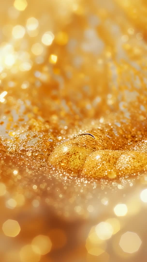 AI Generated Image. Video showing smooth camera pan upward across golden glitter ridge, revealing warm bokeh and sparkling granules in tight macro. Close-up composition creating rich texture and shallow depth of field with hexagonal bokeh highlights. Warm golden palette evoking luxury, celebration, and dreamy glamour. Perfectly suiting vertical ads, social reels, mobile wallpapers, product hero backgrounds, and title overlays. Layering with type, logo, animated text, or slow reveal transitions creating premium brand spots and holiday campaign visuals.