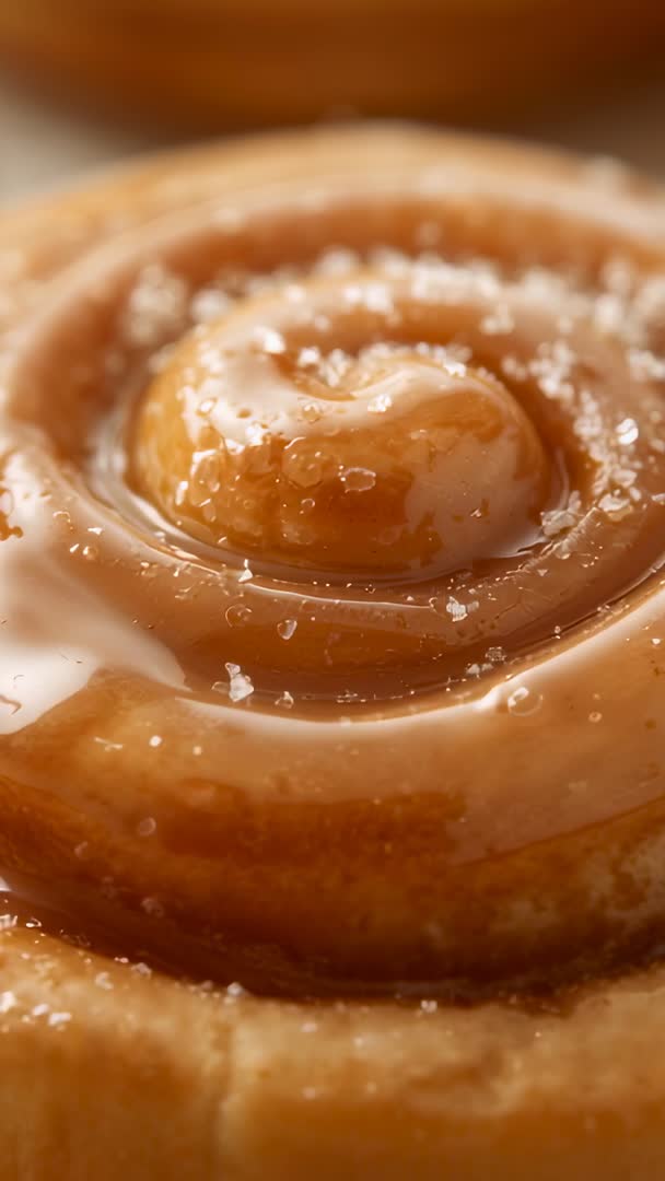 AI Generated Video. Featuring macro vertical video revealing spiral of caramel glaze and salt crystals on cinnamon roll. Capturing glossy surface, glaze drips, and crystal texture in cinematic shallow depth of field. Showing slow camera shift upward along spiral for dramatic product reveal. Ideal for food commercial, bakery branding, recipe reel, social media ad, menu background, packaging detail, cooking show opener. Serving marketing campaigns highlighting salty-sweet contrast, texture focus, or ingredient feature. Pairing with warm acoustic music, adding slow zoom, including close-up captions for ingredient callouts. Delivering appetizing, tactile footage for food creatives and content producers.