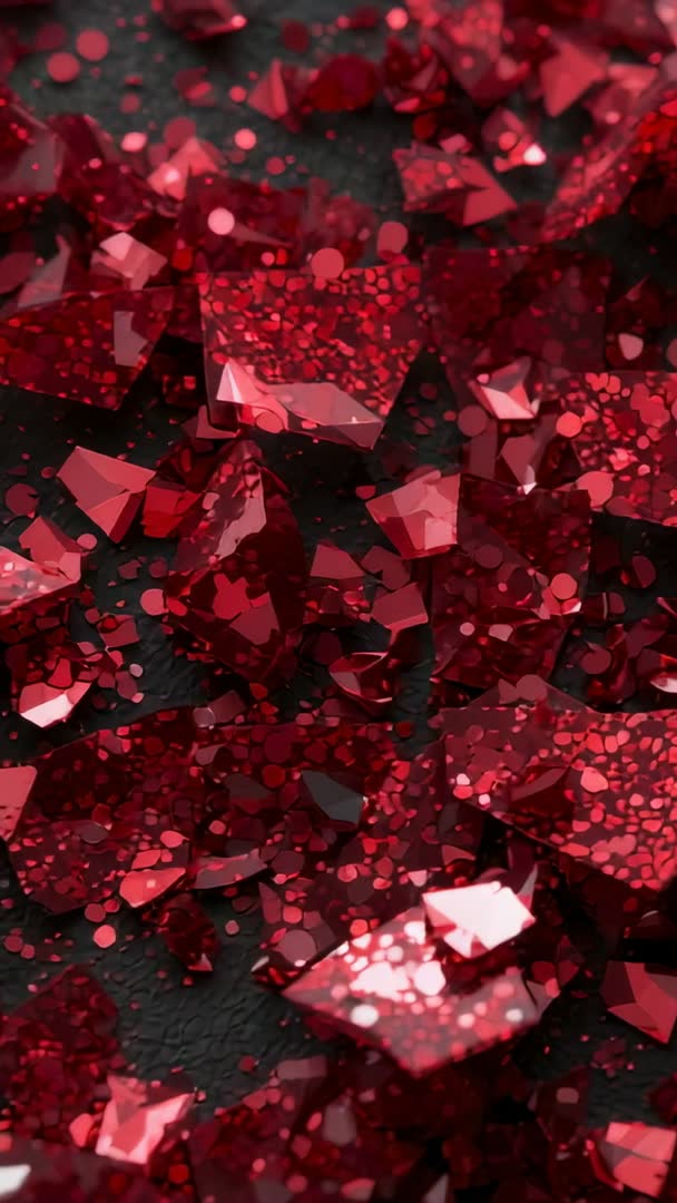 AI Generated Video. Showing close-up movement of ruby red faceted shards and scattered glitter on dark textured surface. Camera panning across shimmering fragments, gleams shifting with each frame and reflecting light for rich sparkling motion. Perfect for adding dramatic vertical content to social media reels, TikTok and Instagram stories, mobile ads, luxury product reveals, holiday promos, jewelry showcases, and craft or beauty tutorials. Integrating as looping background, overlaying title cards, or serving as transition plate in motion graphics. Consider slowing footage for heightened sparkle, boosting contrast for deeper reds, and applying subtle vignette for focused highlights. Serving as color palette inspiration and brand accent for seasonal marketing, packaging, editorial visuals, and cinematic motion backgrounds.