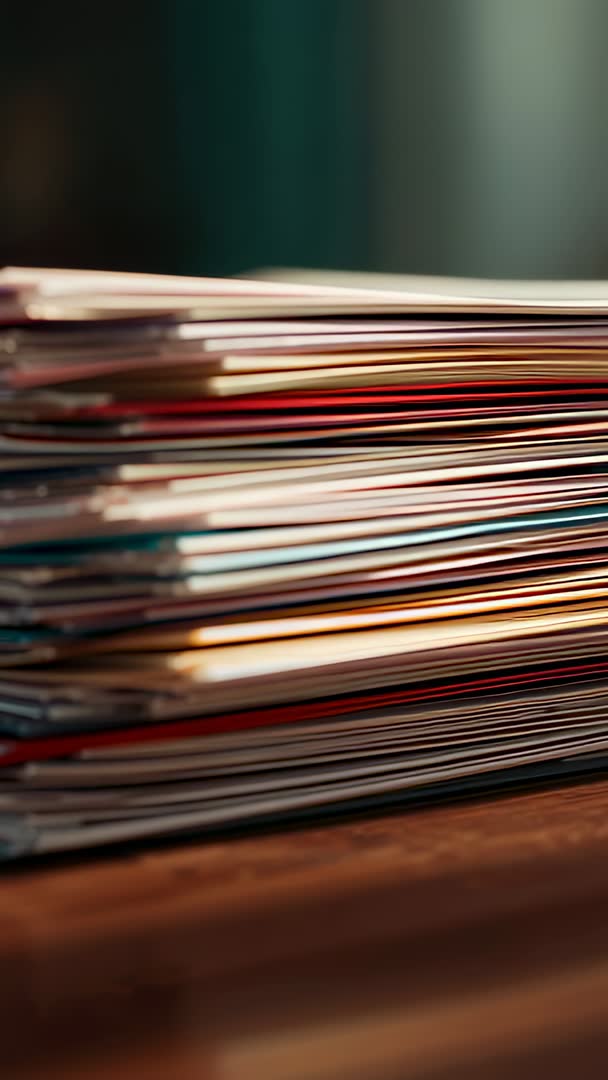 - Vertical macro video capturing colorful stacked papers, magazines and envelopes on wooden table