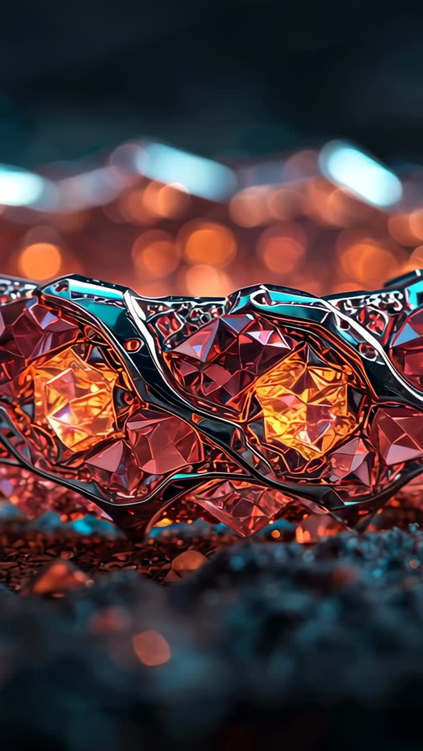 AI Generated Image. Showing close-up shifting focus on ornate metallic lattice band studded with glowing rubies and deep red facets. Camera capturing macro focus pull with shallow depth of field and cinematic bokeh. Lighting producing warm amber highlights and cool blue reflections on metal, creating high-contrast luxury mood. Vertical 9:16 composition suiting mobile-first platforms, social stories, reels and product ads. Usage ideas: suiting luxury brand hero clips, enhancing jewelry product pages, supplying background motion for valentine or holiday campaigns, supporting craft and gemology editorial content, illustrating close-up detail in how-to or making-of videos. File notes: silent loop-friendly shot with smooth focus ramp and rich color separation for color grading.