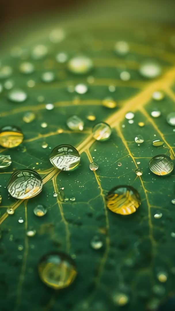 AI Generated Image. Vertical macro video showing water droplets resting on green leaf with yellow veins, reflecting warm light and fine vein texture. Close-up composition creating strong foreground interest and shallow depth of field for cinematic look. Serving nature documentaries, gardening tutorials, wellness and spa promotions, eco and sustainability campaigns, social media reels and smartphone backgrounds. Working as looping background, title opener, transition element, product presentation backdrop, or calming visual for meditation apps and websites. Color palette highlighting deep green and golden yellow tones, supporting branding focused on freshness, hydration and natural beauty.