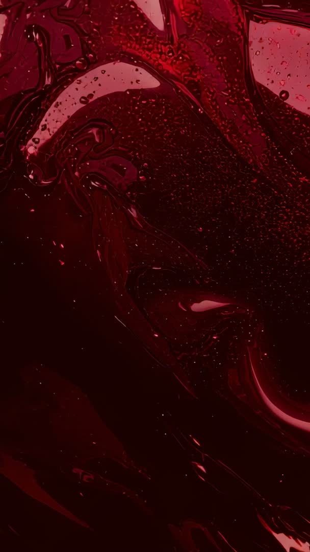 - Vertical macro video glossy crimson liquid rippling with shifting light and bubbles