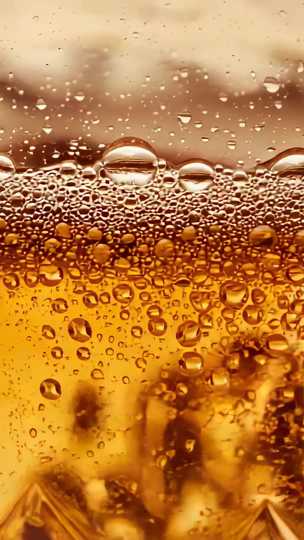 - Vertical macro video of amber soda bubbling with ice and condensation, close-up effervescence