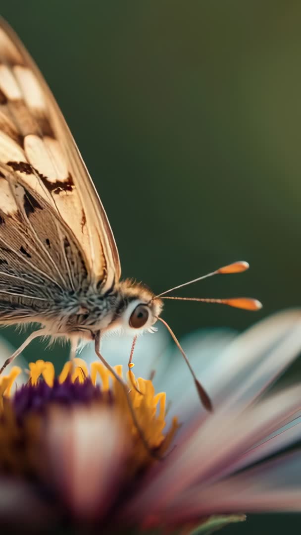 AI Generated Video. Showing butterfly landing and probing daisy disk with proboscis in extreme close-up. Capturing delicate antennae, detailed wing patterns, and nectar-feeding motion against smooth green bokeh. Featuring vertical 9:16 framing and shallow depth of field for cinematic mobile playback. Providing versatile footage for nature documentaries, pollinator awareness campaigns, gardening blogs, vertical social media ads, smartphone wallpapers, and educational shorts. Working well as slow-motion loop, hero background clip for websites, intro footage for environmental presentations, or stock motion for commercial spots. Offering technical clarity with macro lens detail, warm natural light, and tight focus on eye and proboscis. Tagging suggestions include close-up pollination, insect behavior, nectar feeding, orangetip butterfly, garden macro, and bokeh.